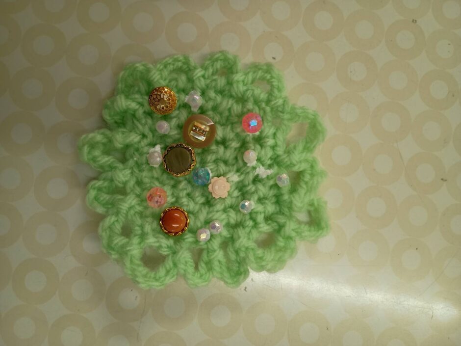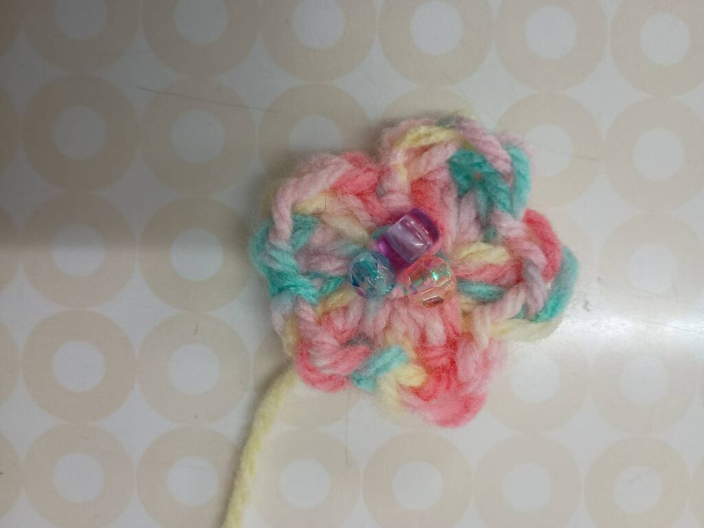 小学1年生のAちゃん、前回は鎖編をマスターし、今回は初めて細編に挑戦。正方形のモチーフに縁編みもできて、ビーズを付けて完成!とても初めてとは思えない素敵な作品が仕上がりました。